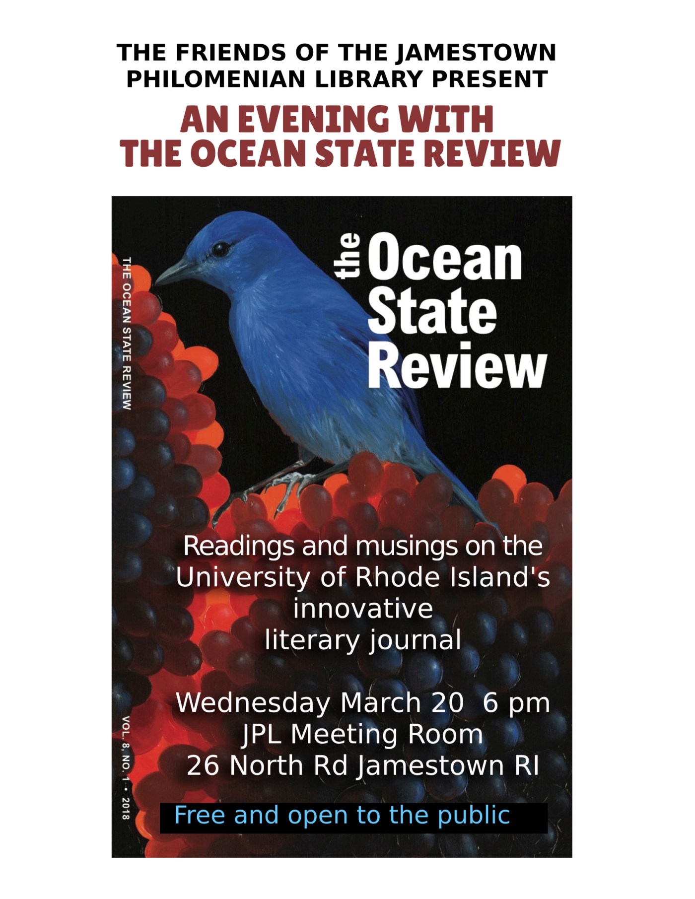 The Friends of the Jamestown Philomenian Library will present an Evening with the University of Rhode island’s innovative literary journal, The Ocean State Review on Wednesday evening, March 10, at 6 PM. The program will feature a brief panel discussion about the journal’s past, present and future, followed by readings from this year’s outstanding issue.